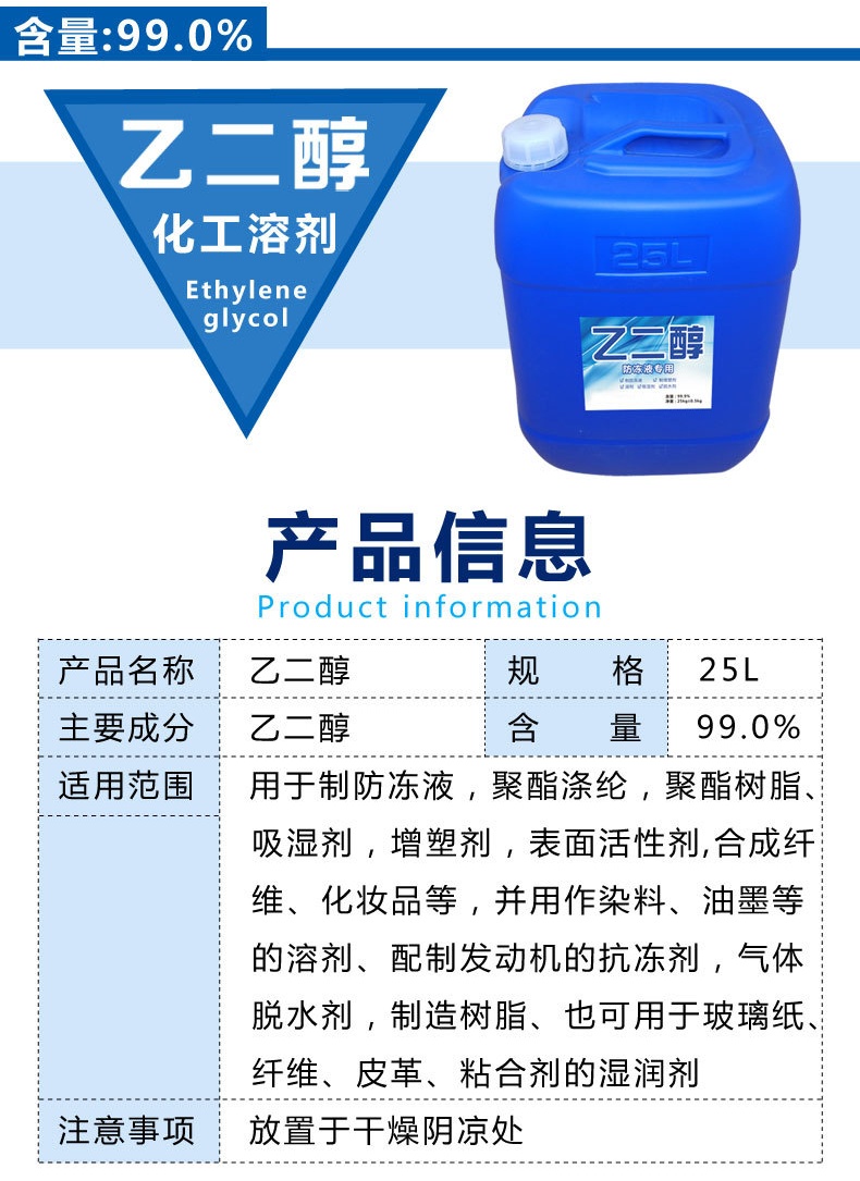 主要用于制聚酯,涤纶,聚酯树脂、吸湿剂,增塑剂,表面活性剂,合成纤维、化妆品和炸药,并用作染料、油墨等的溶剂、配制发动机的抗冻剂,气体脱水剂,制造树脂、也可用于玻璃纸、纤维、皮革、粘合剂的湿润剂。可生产合成树脂PET,纤维级PET即涤纶纤维,瓶片级PET用于制作矿泉水瓶等。还可生产醇酸树脂、乙二醛等,也用作防冻剂。除用作汽车用防冻剂外,还用于工业冷量的输送,一般称呼为载冷剂,同时,也可以与水一样用作冷凝剂。